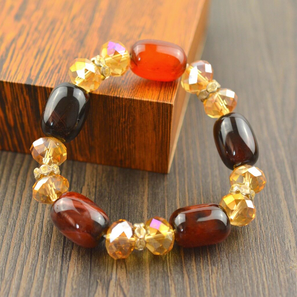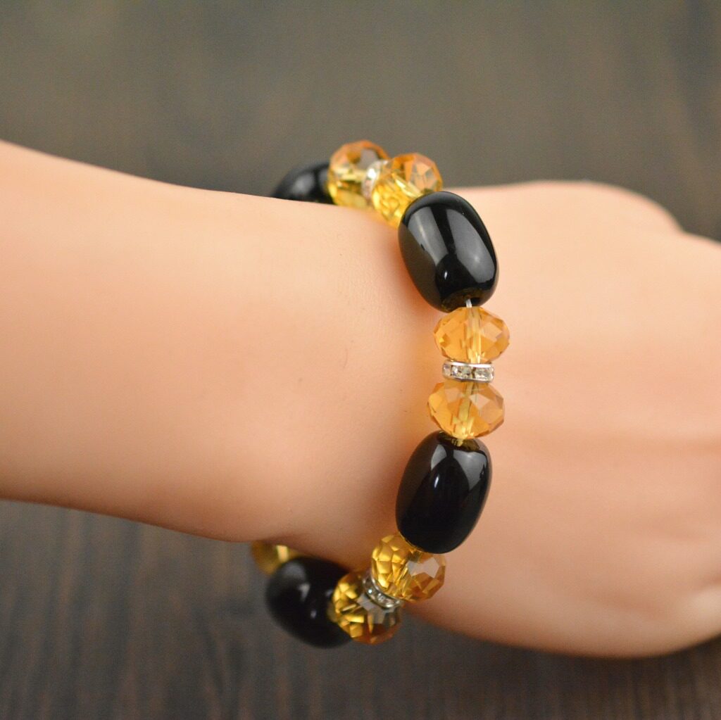 楕円形の艶やかな天然石と、カット加工を施した水晶が美しく調和し、手元を華やかに彩ります。