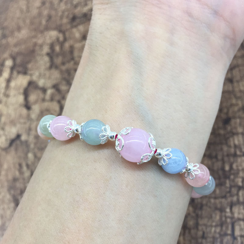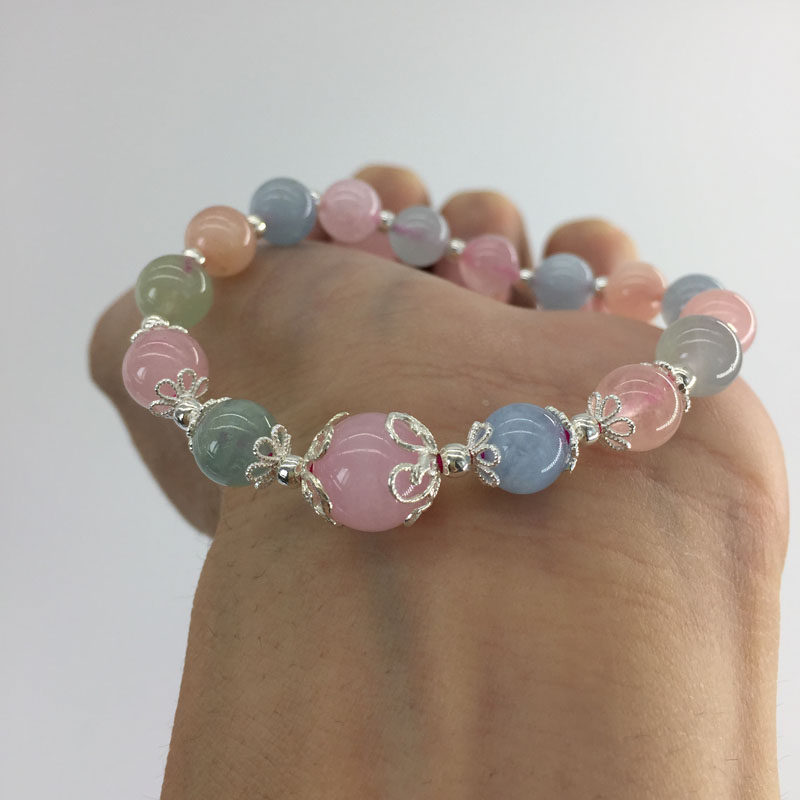 柔らかな印象の天然石を贅沢に使用したパワーストーンブレスレットです。 数珠として丁寧に仕立てられ、一粒ごとに銀色の装飾が施されています。 ローズクォーツやアクアマリンなど複数の天然石を組み合わせ、癒しと調和のエネルギーを高めます。 透明感のある丸玉が優しく手首を飾り、日常使いから特別な日まで幅広くお使いいただけます。 心を穏やかに整える数珠ブレスレットです。